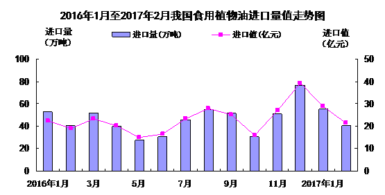 (一)棕櫚油、菜子油庫存較低帶動食用植物油整體進口增加。去年12月底,全國港口食用棕櫚油庫存僅27.08萬噸,處于歷史低位,出于補庫存的需要,去年四季度國內貿易商訂購了大量今年一季度船期的貨,截止3月1日,全國港口食用棕櫚油庫存增加57.5萬噸,但仍低于去年同期88萬噸的庫存水平。同時,自2015年起,我國共進行了43次臨儲菜子油拍賣,成交416.29萬噸,截至目前,臨儲菜油剩余量已經不足200萬噸,在今年新作油菜籽上市前,臨儲菜油有望全部拋售完畢,而2016年我國油菜籽產量為1400萬噸,比上年下降5.7%。國內產量不足,臨儲菜油即將拋售完畢,貿易商擴大菜油進口以補充缺口。前2個月,我國進口棕櫚油和菜子油同比分別增加6.5萬噸和2.7萬噸,拉動我國食用植物油整體進口量增加。