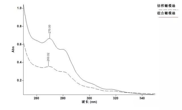 橄欖油中含有的某類氧化物在270nm處有最大吸收波長(見下圖),海關行業(yè)標準HS/T 57—2017《橄欖油消光系數(K270)的測定方法》就是利用初榨橄欖油中氧化物含量較低,而經過加熱、脫色和脫酸等精制工序處理后的橄欖油中氧化物含量較高,通過測量一定濃度下橄欖油樣品在270nm紫外吸光度,鑒別初榨橄欖油與其他橄欖油。