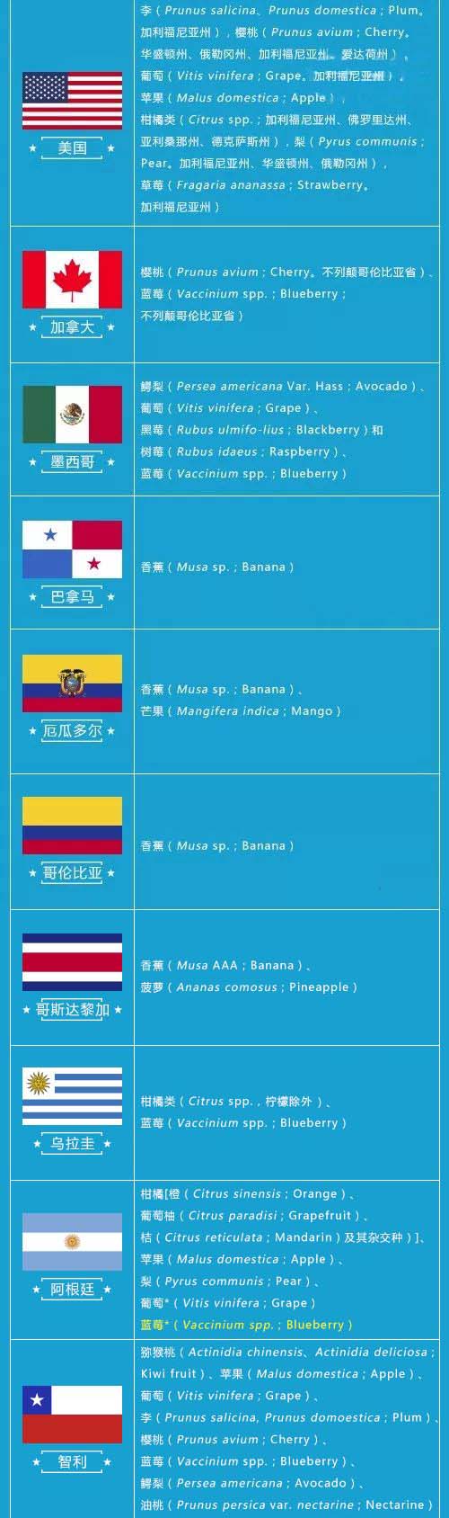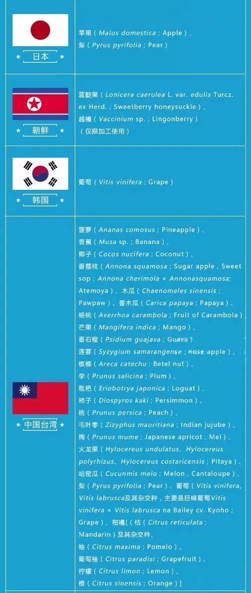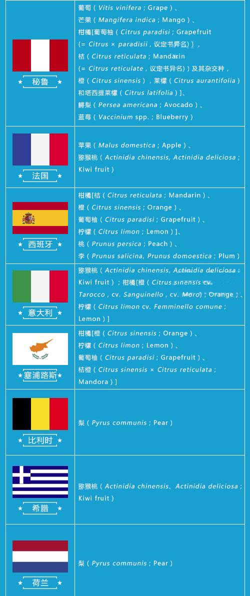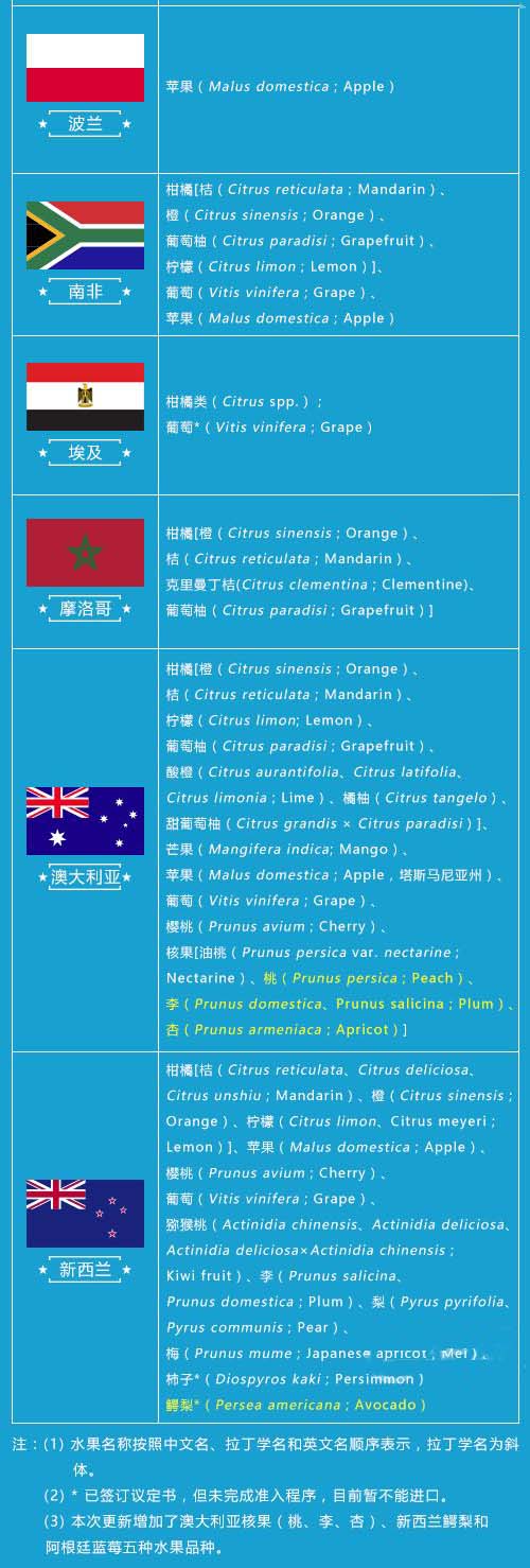 博裕食品進(jìn)口報(bào)關(guān)行獲悉,近日,國(guó)家質(zhì)檢總局官網(wǎng)更新2018年進(jìn)口水果準(zhǔn)入名單,博雋進(jìn)口了解到這是今年第一次更新的進(jìn)口水果準(zhǔn)入名單。在本次更新名單中的有:澳大利亞桃(Prunus persica;Peach)、李(Prunus domestica、Prunus salicina;Plum)、杏(Prunus armeniaca;Apricot)、新西蘭牛油果(Persea americana;Avocado)、以及阿根廷藍(lán)莓(Vaccinium spp.;Blueberry)。