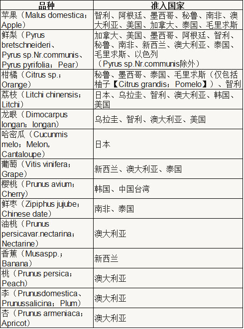 中國國家質檢總局(AQSIQ)發布了最新版的“獲得其他國家/地區檢疫準入的出口新鮮水果名錄”。